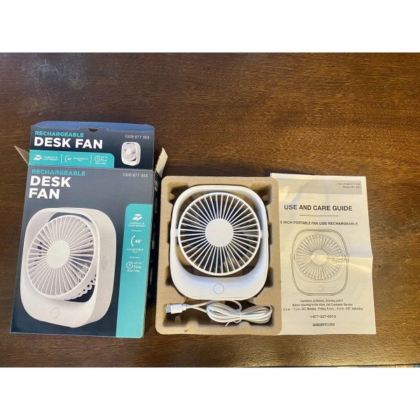 This rechargeable desk fan is a must-have for any home or office. With its USB power source, it is easy to use and move around. The fan comes in a sleek white color and is designed for use on tables or desks. It is 5” and USB rechargeable. Can also run plugged in with USB cable