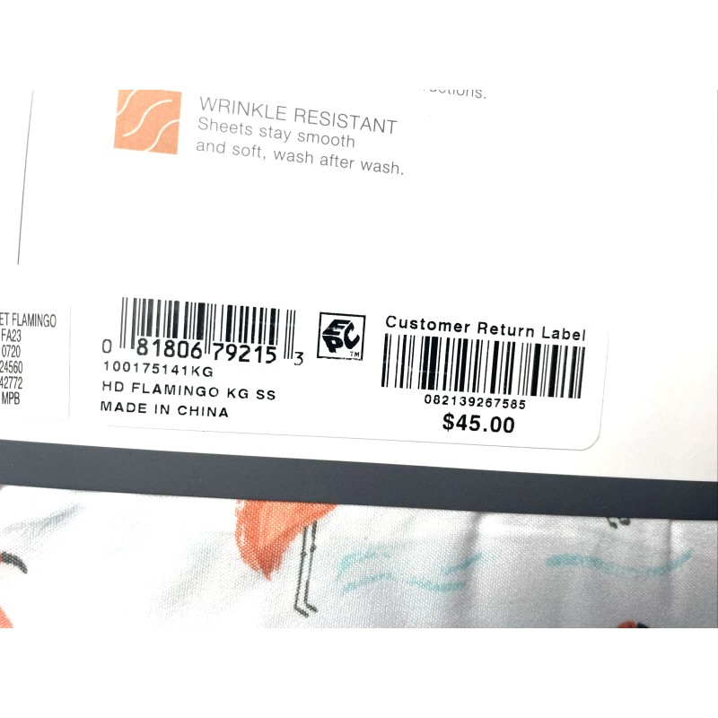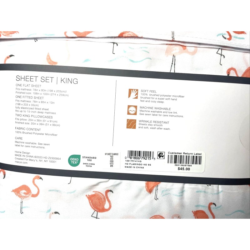 • Set includes: flat sheet (108" x 102"), fitted sheet (78" x 80" x 13"), two pillowcases (20" x 39")