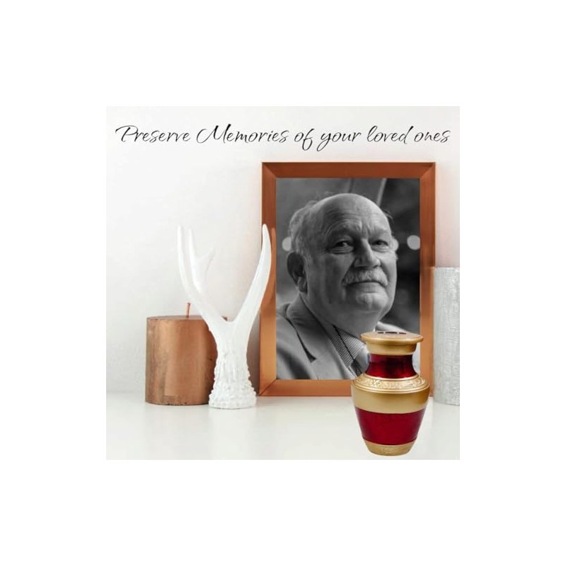 - Elegant Design: This small funeral urn features a striking red and gold stone finish with intricate detailing for a timeless and dignified appearance.