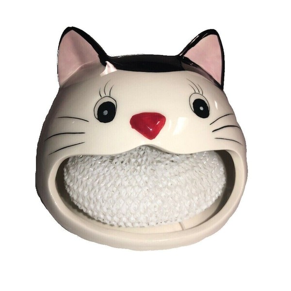 Home Essentials and Beyond CAT Scrubby Ceramic Holder with Scrubbie Sponge Kitchen Sink Scouring Pad NEW