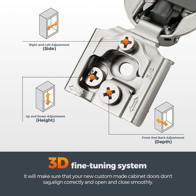 - 3D Adjustable Upgrade: 3D Hinges Allow for Easy Adjustment of Cabinet Doors (Vertical, Horizontal, Depth) with Just a Screwdriver, Ensuring That Your Custom-Made Cabinet Doors Don’t Sag, Align Properly, and Open/Close Smoothly