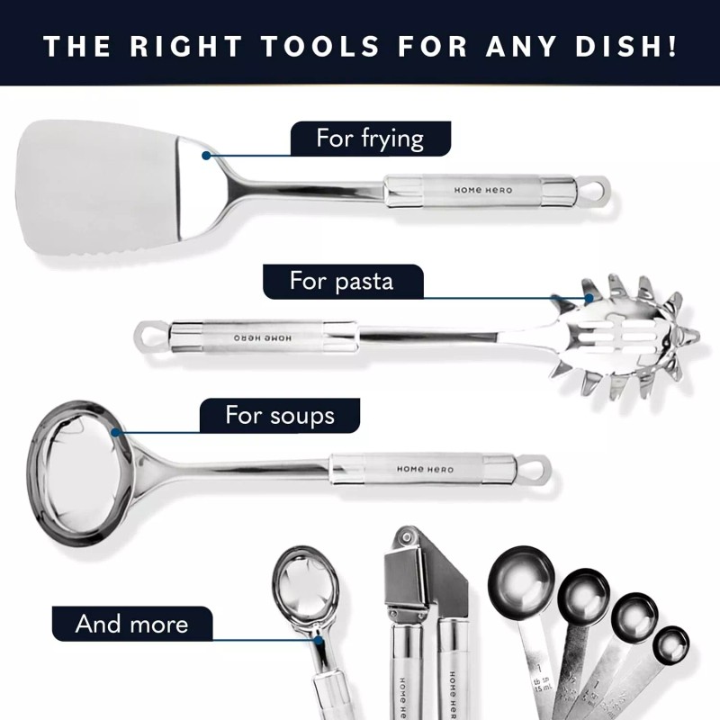 - Suited to any kitchen, HomeHero is the best kitchen utensils set you could ask for. Crafted with 100% stainless steel & silicone non - stick materials, these timeless stainless steel utensil set are beautiful housewarming gifts. With measuring cups & measuring spoons, skimmer, slotted spatula, garlic press, cheese knife, tea strainer, wine opener, potato peeler & more, you have everything you need to cook masterful meals. Scroll to see complete list of cooking tools.