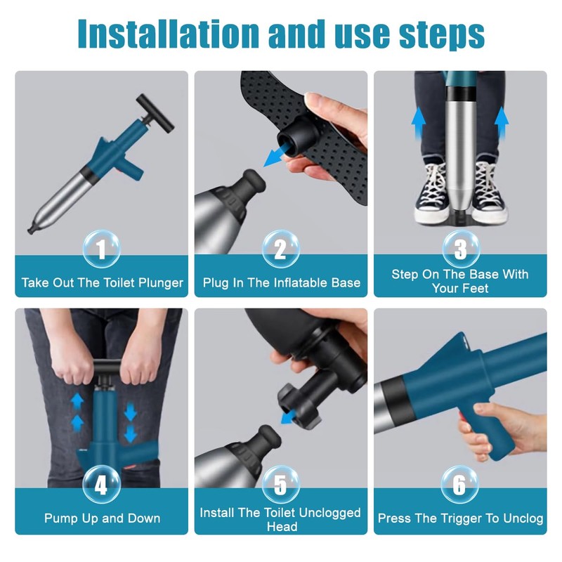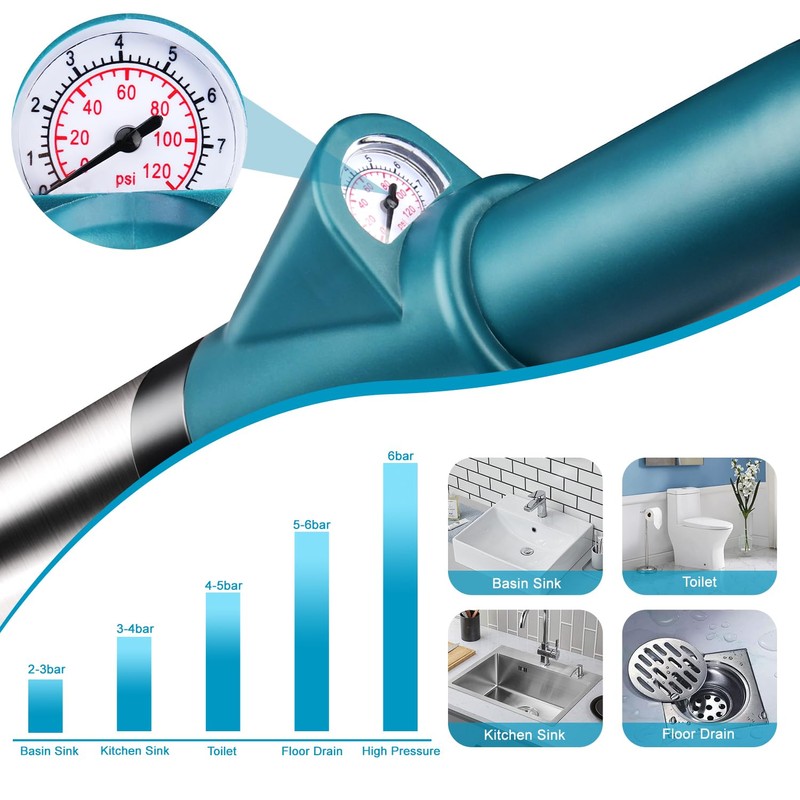 - Experience hassle-free clog removal with our advanced toilet plunger clog remover, harnessing the power of high-pressure compressed air (up to 120 PSI/8 Bar). Say goodbye to stubborn blockages in seconds, whether it's floor drains, showers, sinks, tubs, or clogged pipes.