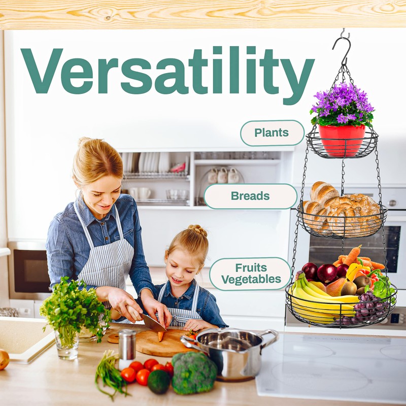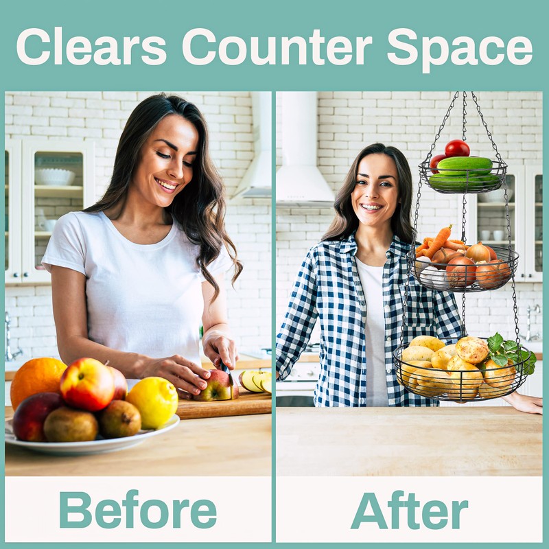 The Home Intuition three tiered hanging basket, sturdy iron wire is ideal for storing fruits, vegetables, food goods, and other kitchen items. The extra storage maximizes kitchen area and prevents counter top clutter.