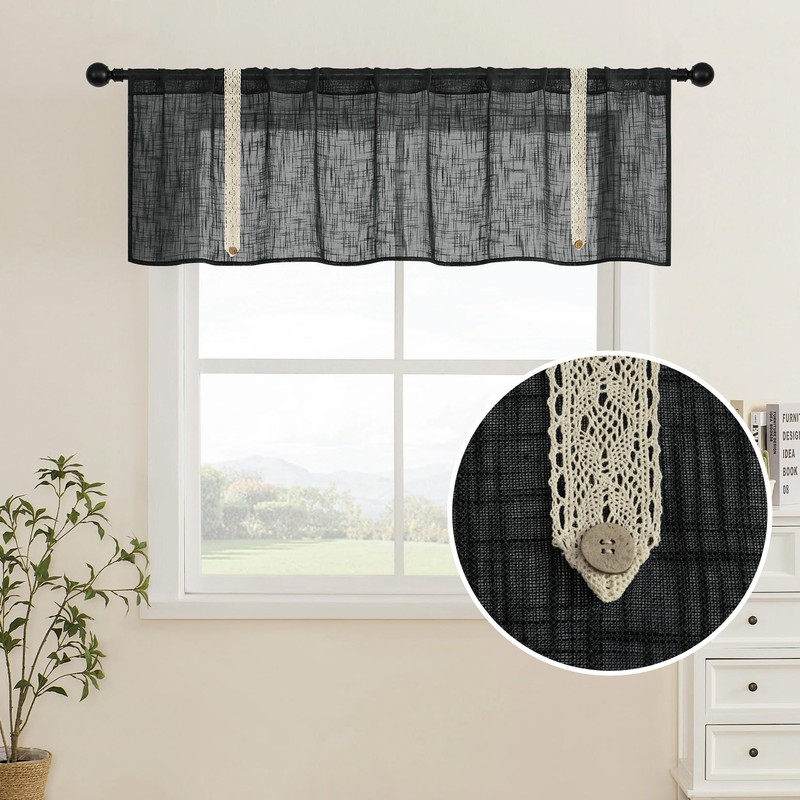 Home Queen Burlap Tie Up Curtain Valance for Kitchen Window, Semi Sheer Linen Texuture Valence with Adjustable Strap, 54" W X 18" L, Black
