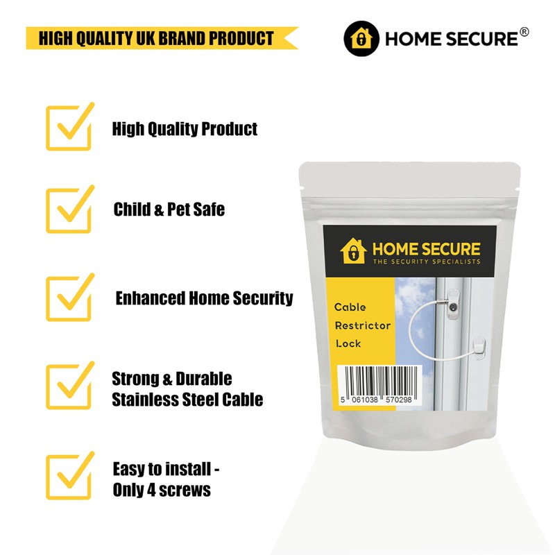 Home Secure™ Cable Restrictor Lock – Key Locking Window Security Device. Child Safety & Pet Prevention Lock. Screw Fixed for Added Security - White