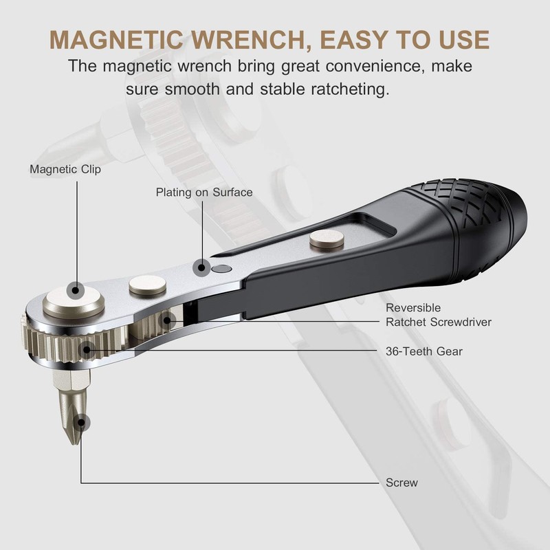 - 【Dual-Purpose Ratchet Wrench】The ratchet wrench (4.3" long) is assembled with a 36-teeth reversible ratchet system to ensure smooth ratcheting in both directions. High-quality teeth provide high torque and precise adjustment compared to 12-teeth or 16-teeth ratchet. Simply flip the button to change direction for tightening or loosening the screws. Bit holders on the head and bottom of the wrench are strongly magnetized for holding the bits.