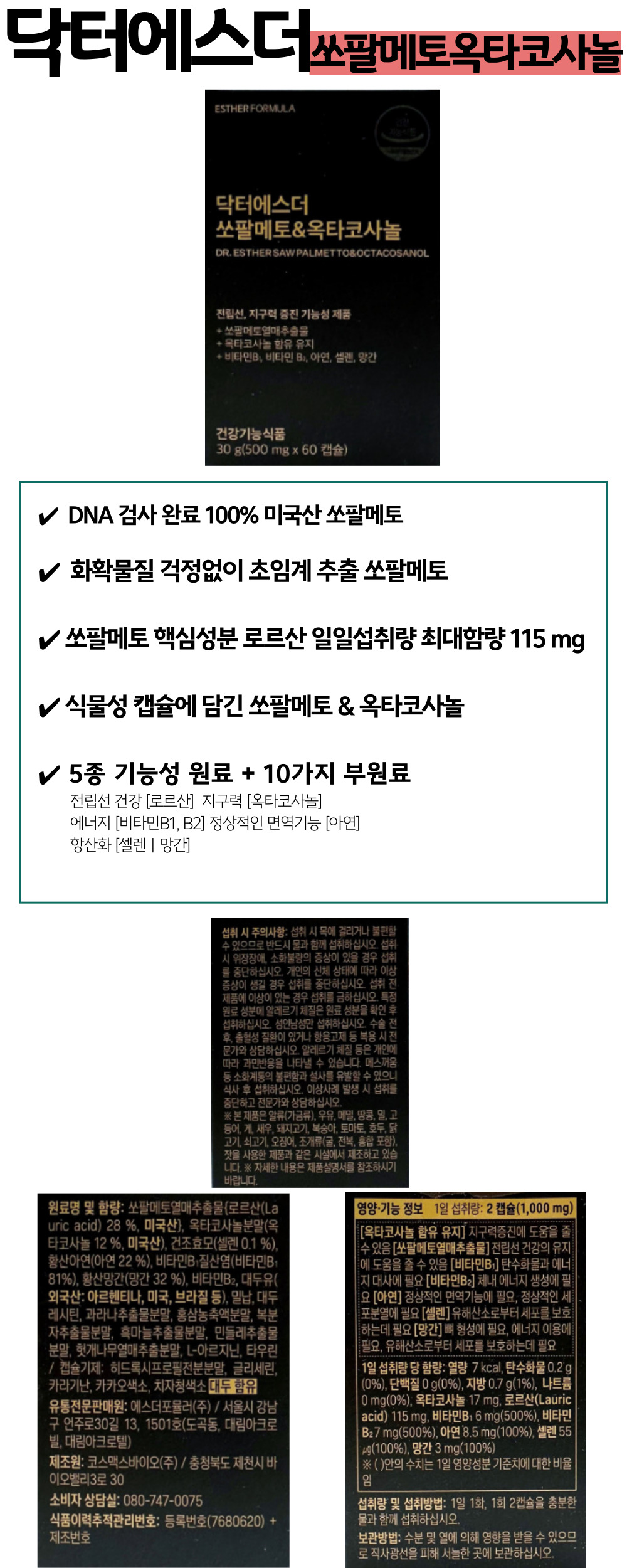 홈쇼핑 50대 남편 옥타코사놀 영양제 지구력 개선 관리 에스더포뮬러 닥터에스더 쏘팔메토 로르산 케어 식