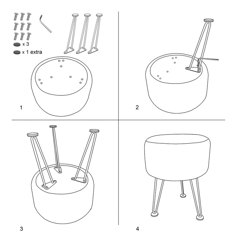 - Minor Assembly: Simply screw metal hairpin legs into each corner of the bench , Be prepared with a Phillips screwdriver, Hairpin legs and screws arrive in the hidden zipper compartment under the seat