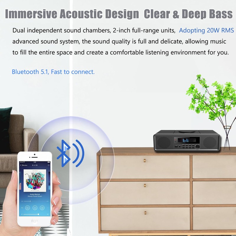 • Top-Loading CD Player:compatible with Playback your favorite CD/CD-R/CD-RW/Audiobooks CD/CD-MP3, with shuffle, repeat and program functions. All in a stylish, compact and modern design that fits perfectly into any home environment.