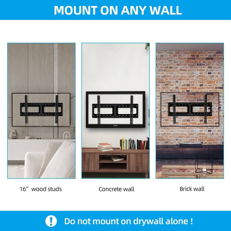 - 【Easy to Install】This wall mount TV bracket comes with instructions that are easy to follow, with a simple 3-step installation process. It perfectly fits for 16-18-24 inch wood studs or concrete/brick walls (anchors included). Please don't mount it on drywall alone.