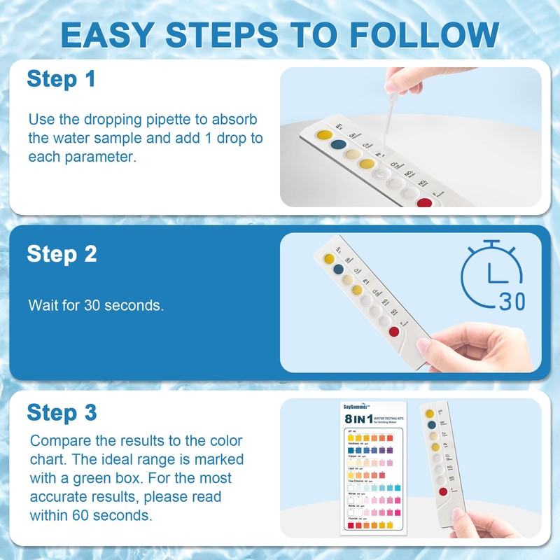 - Simple, Three-Step at Home Water Testing Kit - Testing your water is quick and effortless. Just collect your sample using the included dropper, apply one drop to each test pad, and wait 30 seconds. With clear instructions and a beginner-friendly design, anyone can test with confidence — it’s that simple.