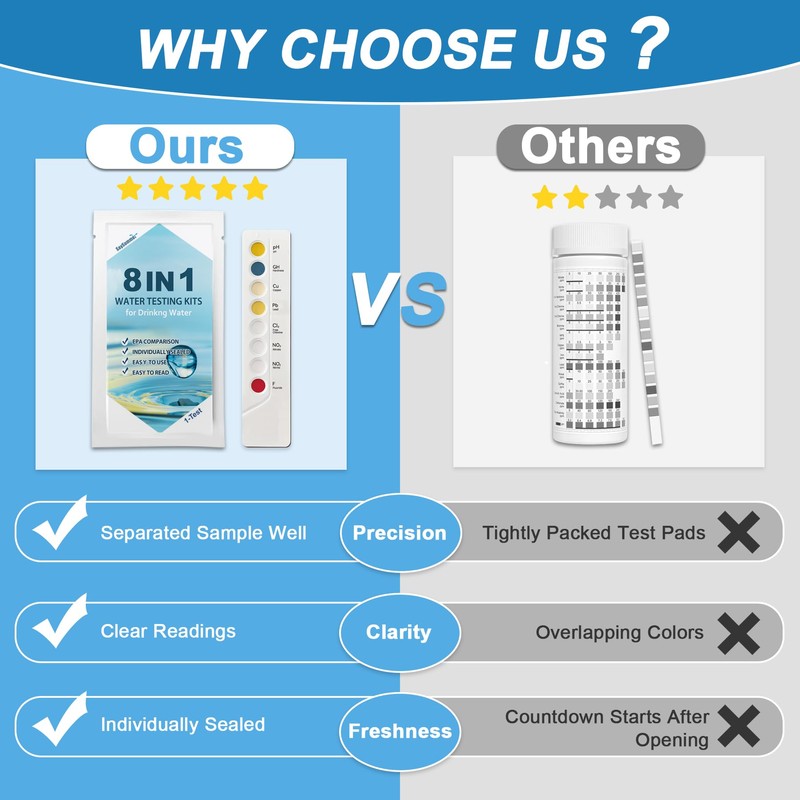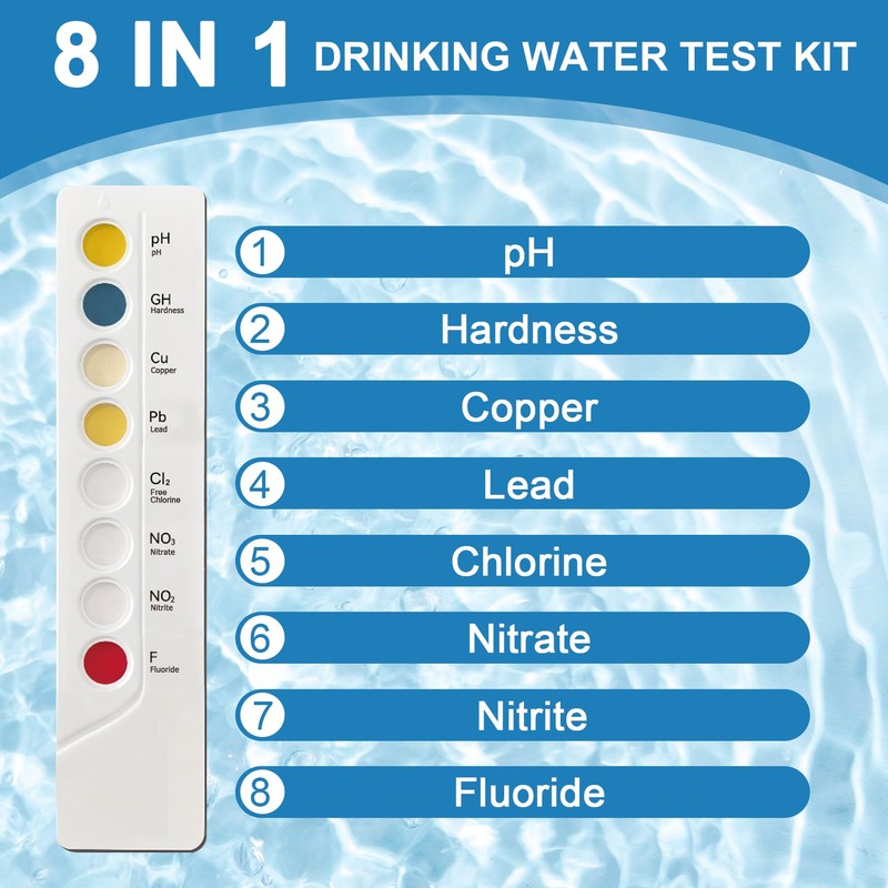 - Comprehensive 8-in-1 Water Quality Test Kit - Designed based on EPA drinking water regulations, this upgraded 8-in-1 water test kit for house checks for the eight most critical elements that impact your health, water taste, and household appliances: pH, Hardness, Copper, Lead, Chlorine, Nitrate, Nitrite, and Fluoride. Featuring an optimized strip structure that delivers clear color results and accurate readings, it’s time to stop guessing and start testing — data beats assumptions when it comes to your water.