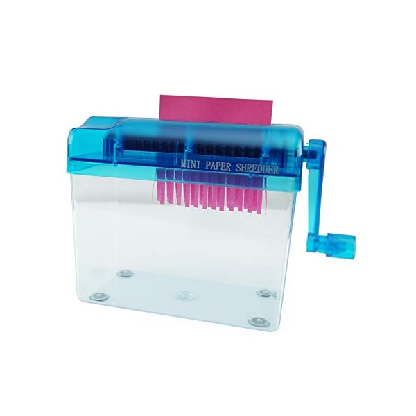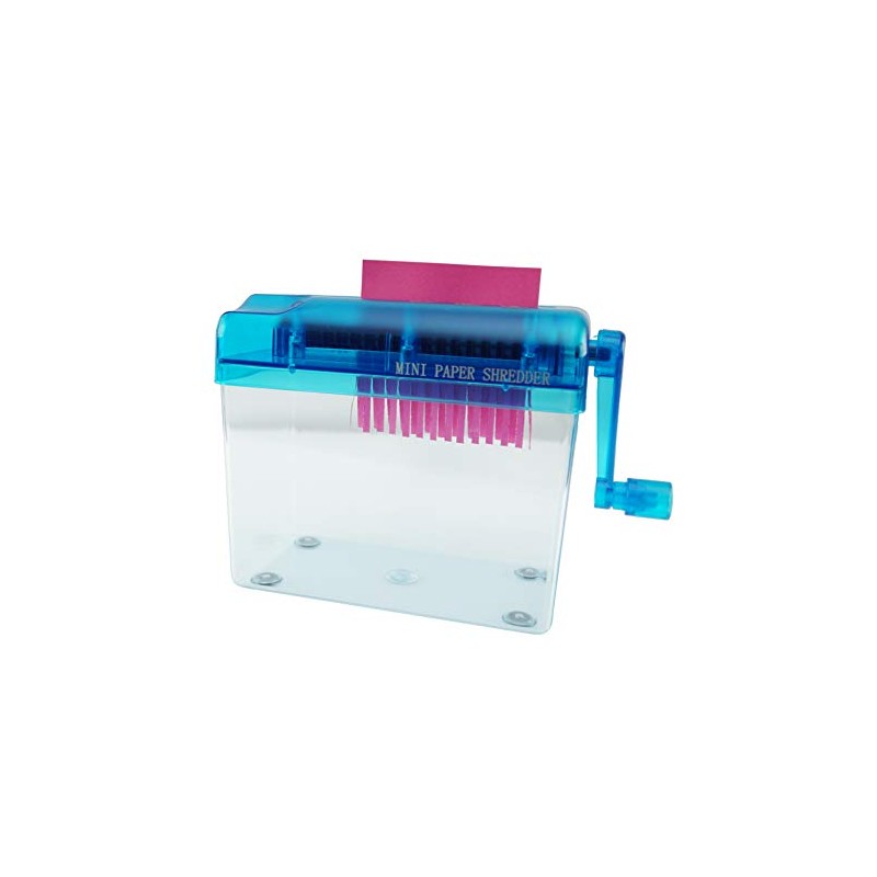 - A PORTABLE & MANUAL SHREDDER: This small and convenient paper cutter is made with durable plastic and is attached to a transparent dust box to help reduce messes. Cut and shred paper documents with ease. You don’t even need to plug it in! Simply crank it with your hand to shred any paper in seconds.