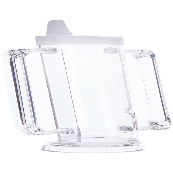 This clear plastic Handy Cup has a capacity of 237ml or 8 fluid ounces and has large handles on both sides that make it exceptionally easy to grip and control. It also has an extra large, circular base that makes it very stable and easy to set down without posing a risk of spills. Another important feature is the asymmetric rim; it is slanted in such a way as to enable the user to drink and empty the cup without having to tilt back his or her head. Normally, the bridge of the nose gets in the way when draining a cup and it is necessary to bend at the neck to finish the drink, which may be painful or difficult for some people, but this cup renders such movement unnecessary.