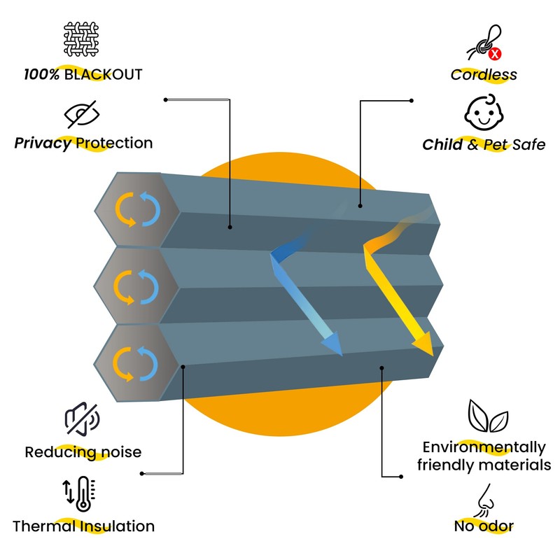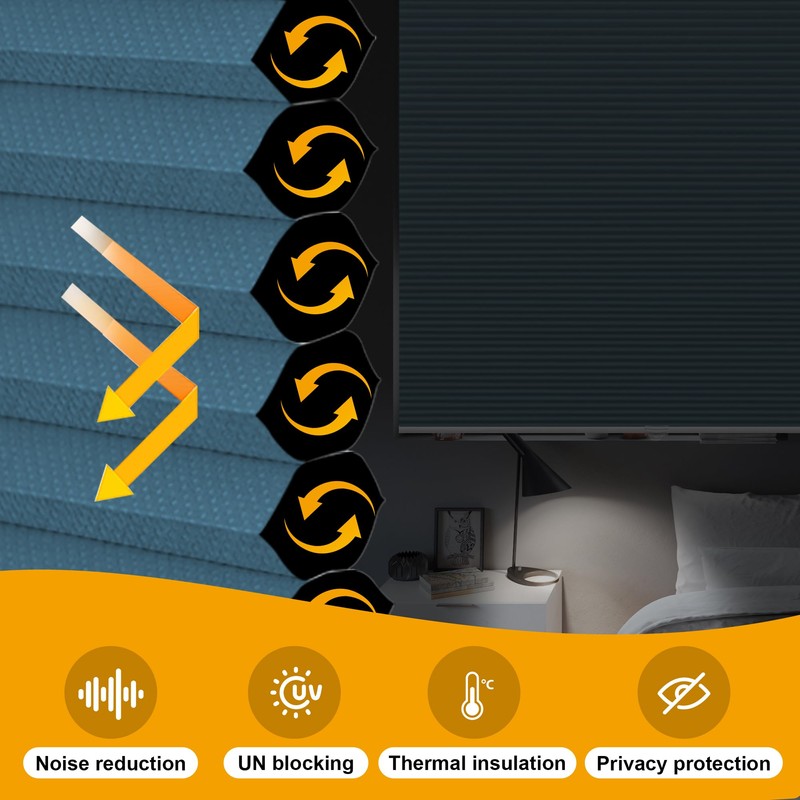 - INSULATION and NOISE CANCELLING: The unique honeycomb structure design creates a hollow cavity layer within the Cellular Shades, which allows air to be stored in the hollow layer, insulating against temperature differences between the indoor and outdoor environments and cancelling the noise. It can effectively keep warm in the winter and cool in the summer and also helps absorb a mount of noisy sound