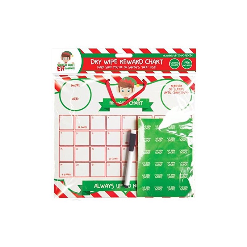 This Elf Reward Chart set contains a card dry wipe board, a marker pen and a set of "I've Been Good!" stickers. The board features elf branding and can be used as a countdown to Christmas to make sure children are on Santa's nice list. Pend and stickers included