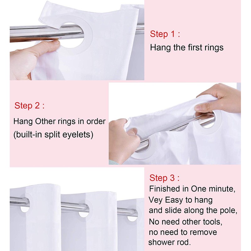 - SUPER EASY TO INSTALL : This shower curtains design with High Quality Flex On Rings that you can very Easy to install it in one minutes, smart design will made it easier to hang and slide along the pole. No need any hooks , no need to remove shower rod.