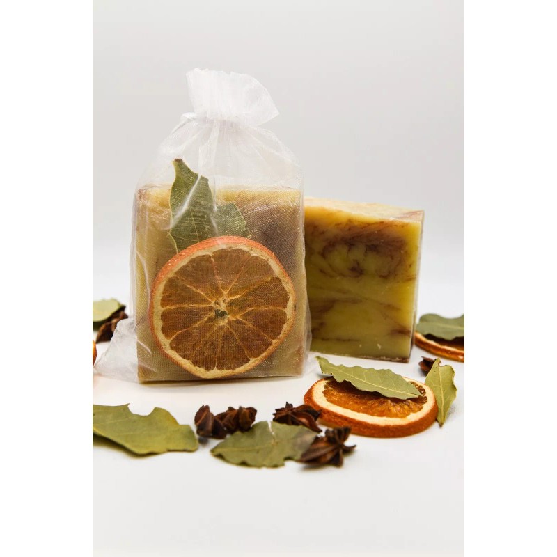 Ingredients: Saponified Oils (Olive Oil, Organic Palm Oil, Organic Coconut Oil, Organic Shea Butter), Essential Oil Blend (Orange Essential Oil, Patchouli Essential Oil, Clove Essential Oil, Cinnamon Essential Oil, Amyris Essential Oil, Anise Essential Oil), Annatto Seed Powder, Rosehip Powder.