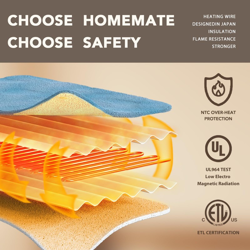 - ★SAFETY: Homemate Electric blankets have passed the American safety UL964 Test.Have ETL Certification.Lower Electro Magnetic Radiation.The heating wire is designed and produced by Japanese company,more advanced technology,stronger insulation and flame resistance.Moreover,the heated blanket use NTC overheating protection technology, 8 hours auto shut off to ensure that it will not overheat and cause burning.