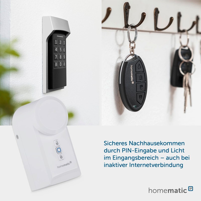 - Komfortables Verriegeln, Entriegeln und sogar ?ffnen der Haustr ist jetzt jederzeit von unterwegs oder vom Sofa aus m?glich. Einfach per Homematic IP App oder Schlsselbundfernbedienung.