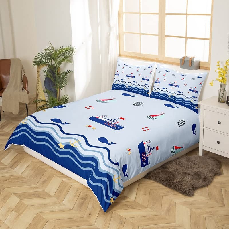 Homemissing Nautical Duvet Cover Sailboat Printed Bedding Set Ocean Themed Comforter Cover for Boys Girls Kids Sea Adventure Bedspread Cover Single With 1 Pillow Case