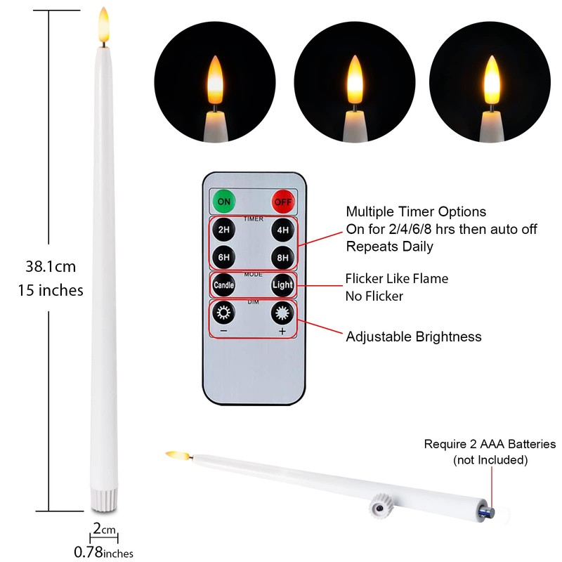 - Great Value Set: Each package contains 6 fake taper candles and 2 remotes, height 15" x diameter 0.78". These flameless candles are powered by 2xAAA batteries (NOT included). The remote and timer are great to keep the batteries from dying so quickly. PS - Do not forget to pull the plastic tab out of the remote before using it.