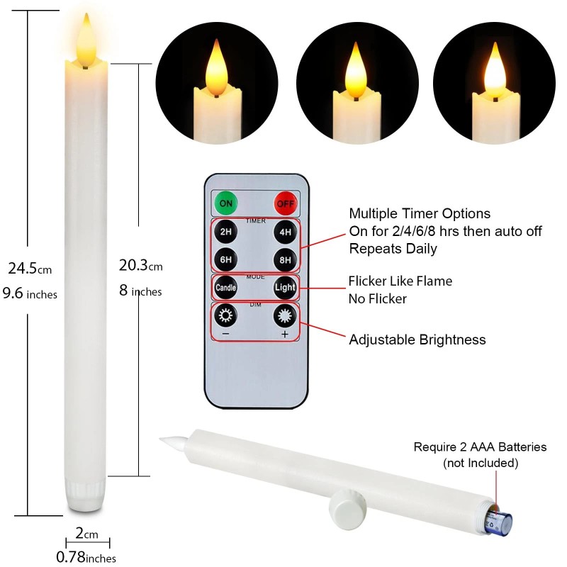 Package and Service: Each package contains 6 taper candles, and 2 pcs 10-key remotes. Each battery power taper candle is thoroughly and rigorously tested before sale, Avoid using them in high-temperature environments. If any problems during use, please contact our Customer Support Team, we will always be at your service.