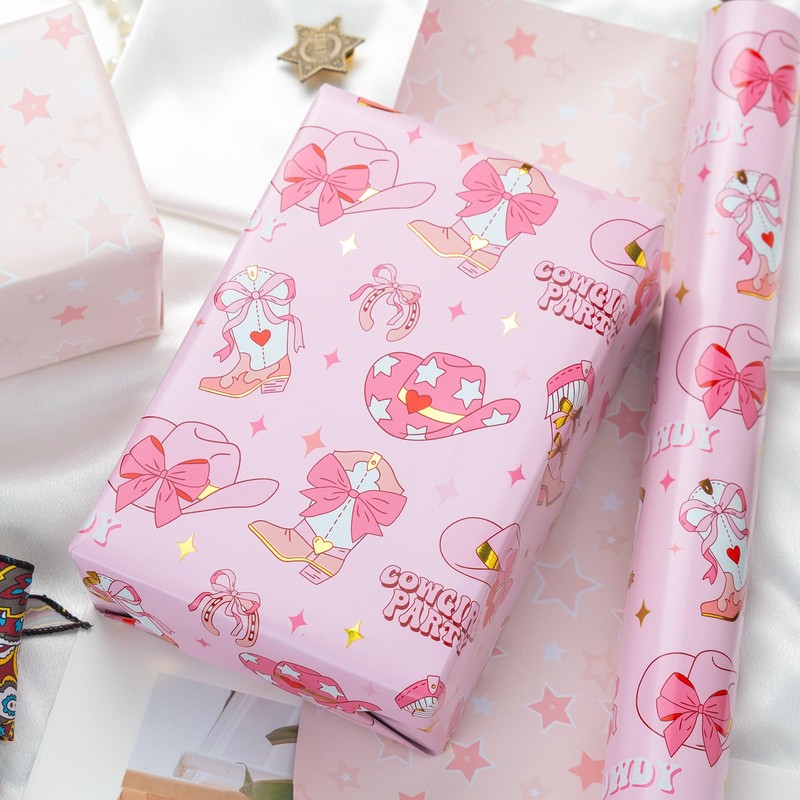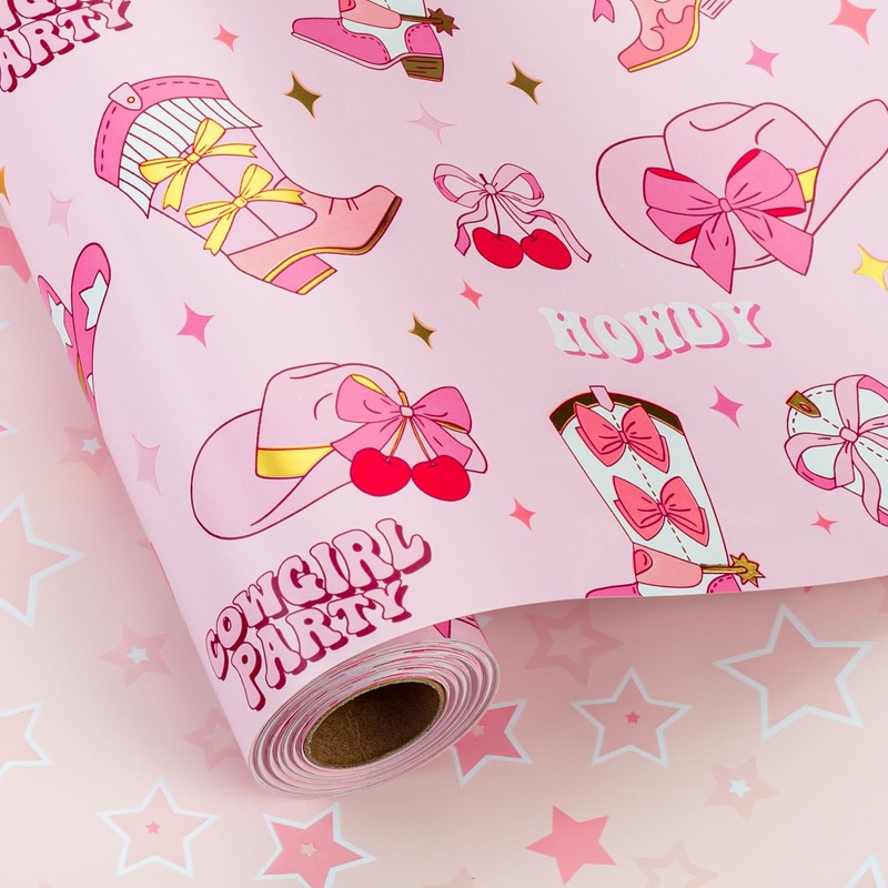 - COWGIRL CHARM DESIGN: This wrapping paper features an adorable pink Western cowgirl theme with boots, hats, cherries, bows, and “Howdy” slogans, perfect for girls who love a fun and fashionable rodeo vibe. Bright and playful, it brings the spirit of a cowgirl party right to your gift