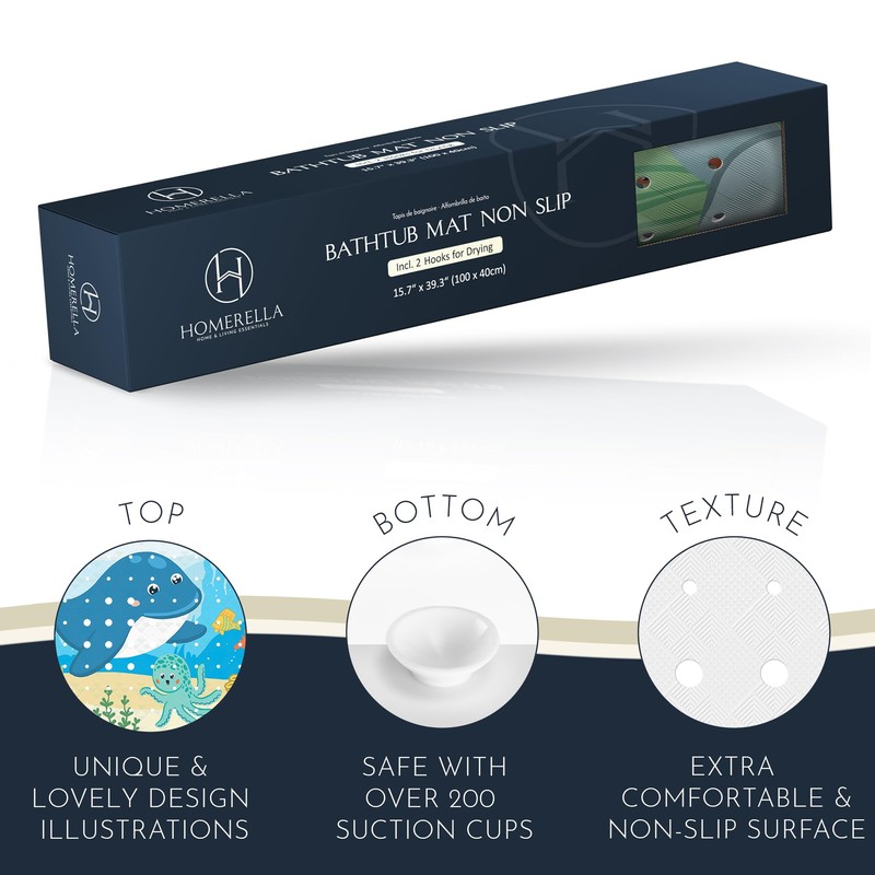 - No More Slipping! The Homerella anti slip mat for bathtub and shower provides a secure grip, even when using shampoo & soap. Enhance your bathing experience with this shower bath mat today!