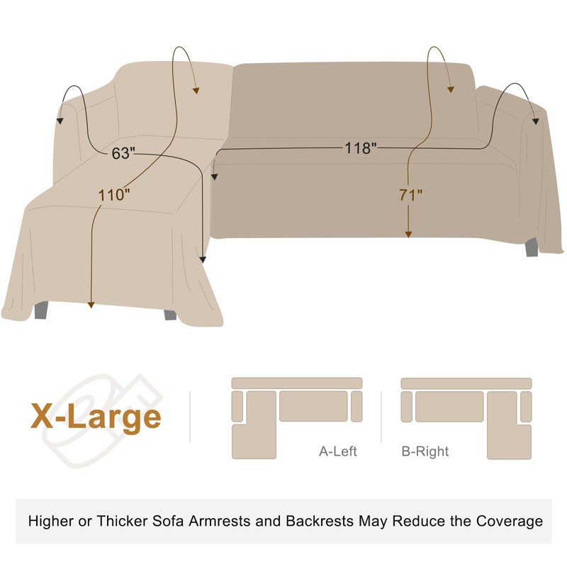 - L SHAPED COUCH COVER: You will receive 2 pieces of Sofa Blankets for your sectional couch. We have 4 size to choose from: Large size(110 * 63+102 * 71 in.) for Right/Left Chaise+2 Seats, X-Large size(110 * 63+118 * 71 in.) for Right/Left Chaise+2 or 3 Seats, XX-Large size(118 * 71 +118 * 71 in.) for Right/Left Chaise+3 Seats, XXX-Large size(118 * 71+91*134 in.) for Right/Left Chaise+3 or 4 Seats. Please refer to our measurement guide to choose the right size before purchase