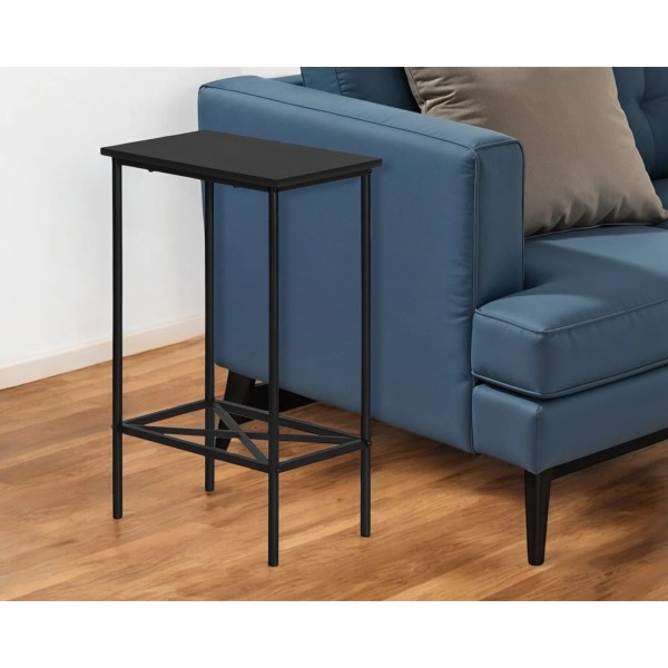 Optimize your space and add some charm to your room with the 24-inch black wood and metal end table with shelf. The black coloration runs throughout this good looking metal and manufactured wood table. Help to keep your space organized with the included open bottom cross over single shelf that is decorative but can also be used for storage of large books, pillows, or blankets. Side tables are a great way to flank your sofa, use as an accent next to your favorite chair, or can even be used bedside. 24-inch h x 15.75-inch w x 9.5-inch d.