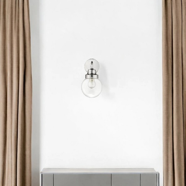 Elevate the look of any space in your home with this One Light Silver Wall Sconce with Round Glass Shade. This classy piece features a round wall bracket which has a downward pointing swing arm attached to it. The swing arm attaches to the top of the light which has a two-step design. The hardware is colored to a shiny silver color. The light shade is made of clear glass and has a fishbowl inspired design. This minimal wall sconce will look great on its own as a statement fixture or you can use a group of these sconces to update the look of any room. 11" H x 6" W x 7" D