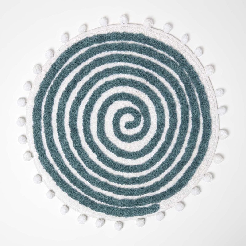 - Absorbent round bath mat tufted with spiral design made of 90% cotton and 10% polyester, hemmed with playful pom poms. Size without pompoms approx. Diameter: 60 cm. Colour: Teal.