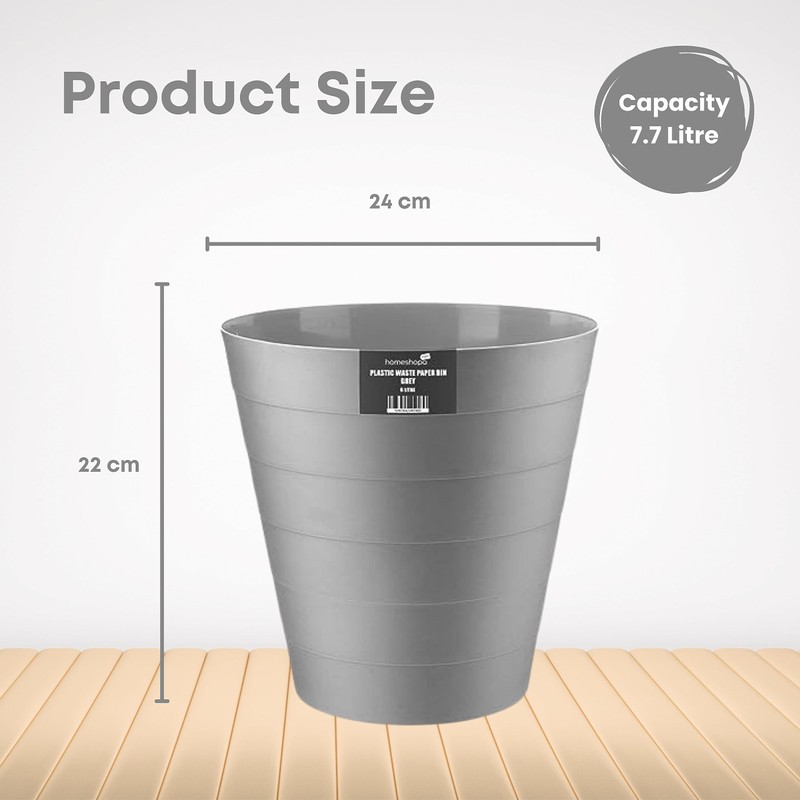 - WHAT YOU GET: This pack of 2 round plastic rubbish bin comes in three different colours: grey, pink, and white. Sturdy, long-lasting plastic and pastel pastel colours provide a practical waste management solution at home or in the office. Each trash bin has a maximum capacity of 6 litres. Each garbage bin measures 24cm in height and 24cm in diameter.
