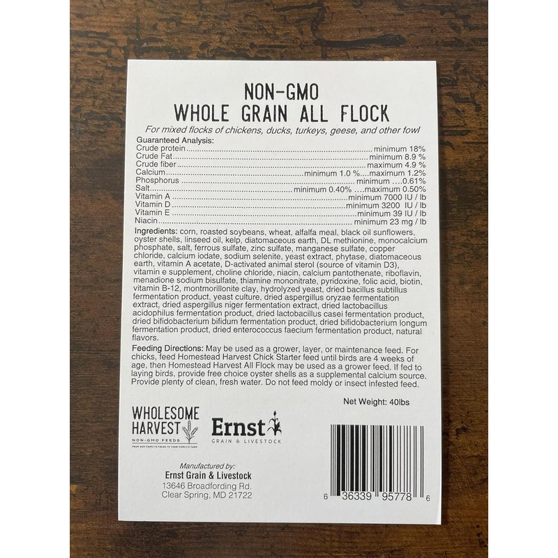 This blend of Non-GMO cracked grains is a complete feed fortified with minerals and vitamins for mixed flocks of chickens, ducks, turkeys, guineas, and geese. This feed meets the niacin requirements of ducks and other waterfowl. For chickens - this mix may be used as a grower, layer, or maintenance feed. It is an ideal choice for growing pullets. If being fed to laying birds, provide free choice oyster shells for supplemental calcium. Like all Homestead Harvest mixes, it contains the good stuff: Multiple Species of Live Probiotics, Prebiotics to prevent toxin contamination, Essential Oils & Herbs, Linseed Oil, a source of omega 3's, Kelp, a natural source of vital minerals and vitamins, Includes diatomaceous earth, Whole Grain Based - No Powdery Mess.