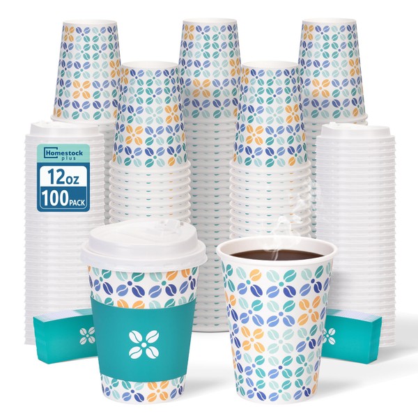 Homestockplus 12oz Disposable Paper Cups -Heavy Duty Paper Coffee Cups with Lids for Hot & Cold Drinks | Leak-Resistant Design for Home, Coffee Shops, Car, Offices, Parties [100 Pack]