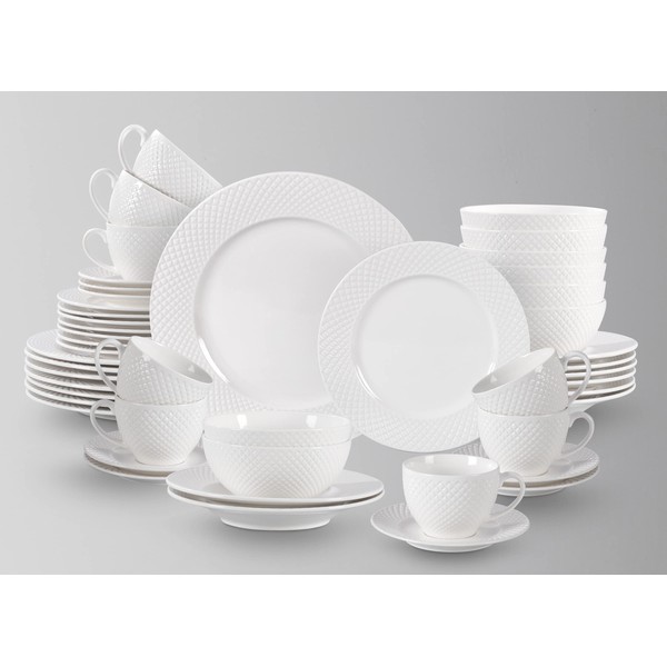 HomeVss, New Bone China Dinnerware Set, Embossed Diamond Design, 48pc Set