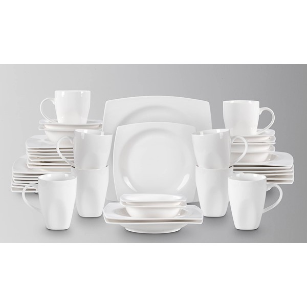 - 40pc Set: Service for 8, Including 8 of each of the following: Square Dinner Plate 10.5", Square Salad Plate 8", Square Soup Plate 9", Square Soup Bowl 5.5", Square Mug 10oz