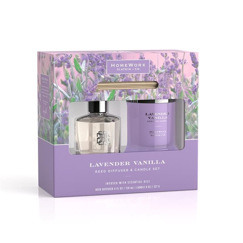 The HomeWorx by SLATKIN + CO. Reed Stick Diffuser and Candle Set make the perfect Gift. Our reeds refresh any space with masterfully blended essential oils and 8 reed sticks to produce room-filling fragrance. Our 1-wick scented candles are created with masterfully blended essential oils and optimized lead-free wicks that produce a clean burn while filling your home with beautiful fragrances. The Lavender Vanilla fragrance includes notes of lavender, vanilla, sandalwood and cedarwood. Shop a wide variety of HomeWorx by SLATKIN + CO. fragrance products to enjoy throughout the year.