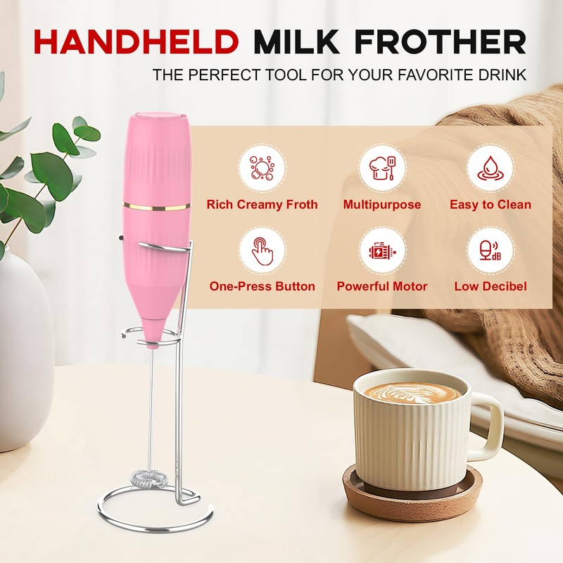 Homexup Handheld Milk Frother 14,000 RPM Drink Mixer Wand with Stand & Stirring Spoon Quiet One-Button Operation, Non-Slip Handle, Detachable Whisk Head for Coffee, Lattes, Cappuccinos, Matcha (Pink)