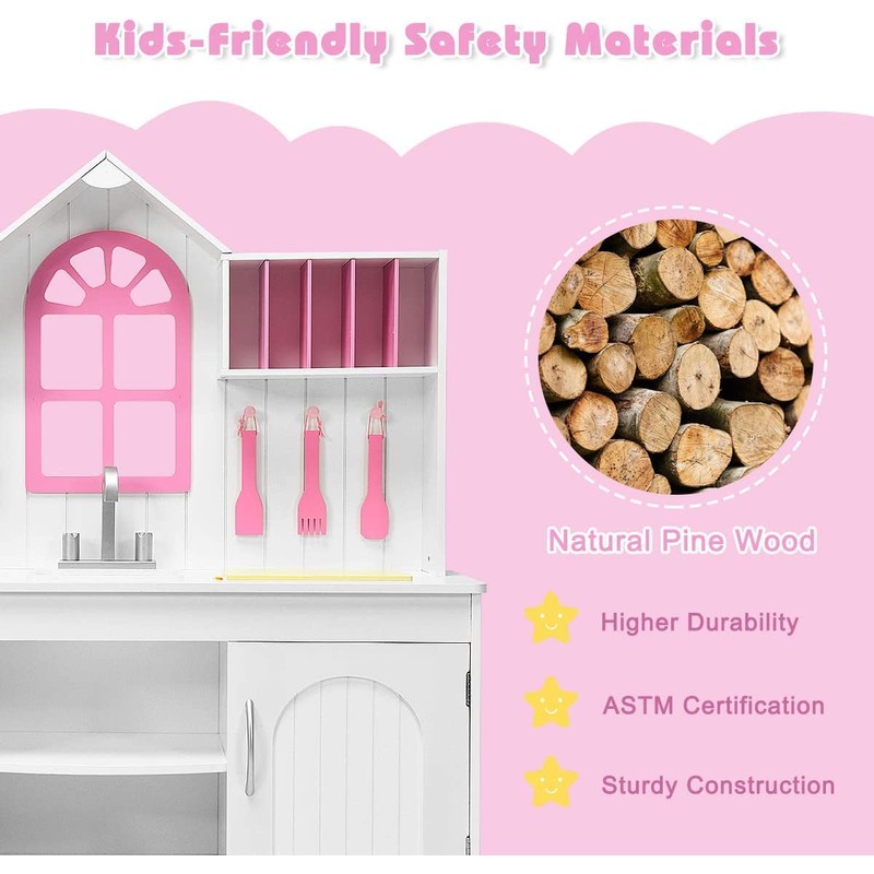 - 【Premium Craftsmanship & Safety】: Kids wooden kitchen is made of high-quality craftsmanship. The surface of the children’s wooden kitchen is smooth and free of burrs. What's more, the paint has the chemical test report provided by SGS, and the board reaches the ASTM Standard, so it is safe, non-toxic and can be used with confidence.