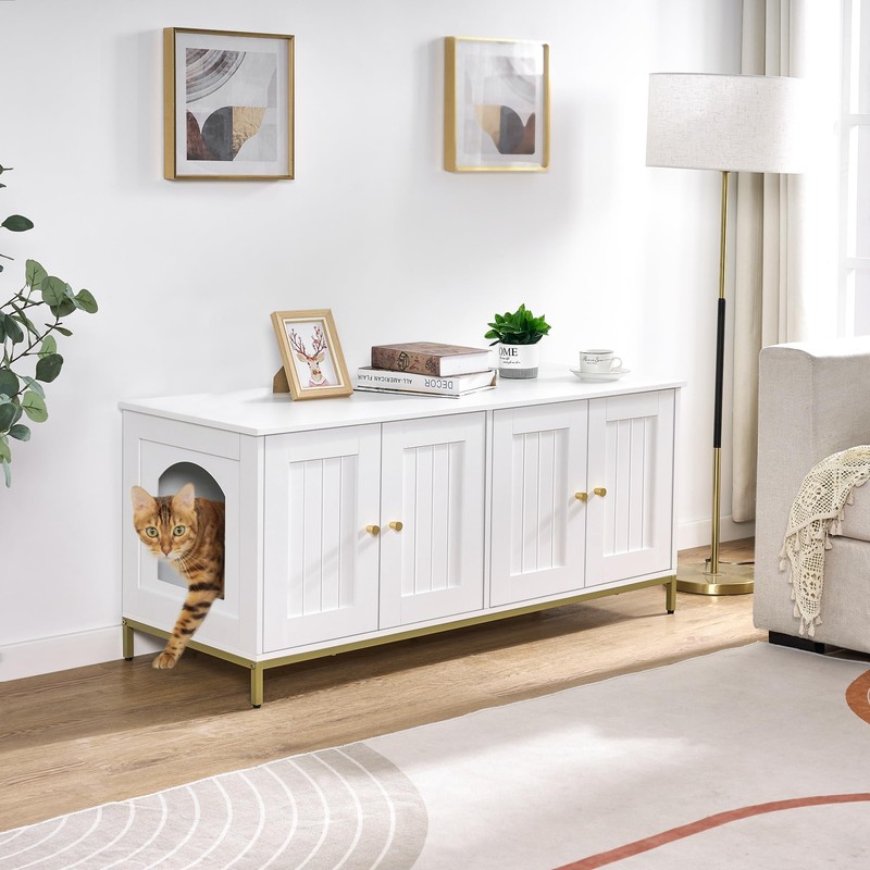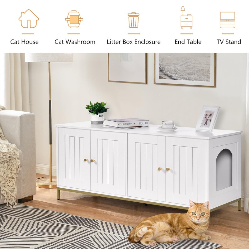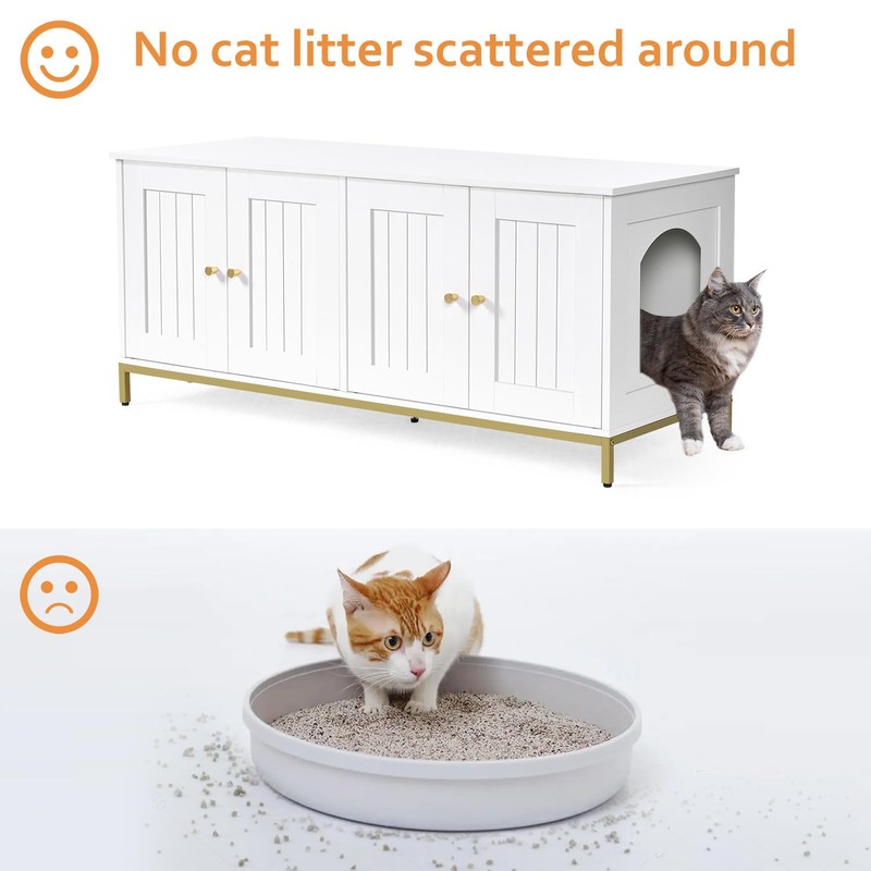 - Modern style: The cat litter box cabinet features white finish and metallic gold-colored metal frame, adding an elegant and stylish touch to your home decor. Its minimalist design and exquisite detailing inject a touch of luxury and sophistication into your living space