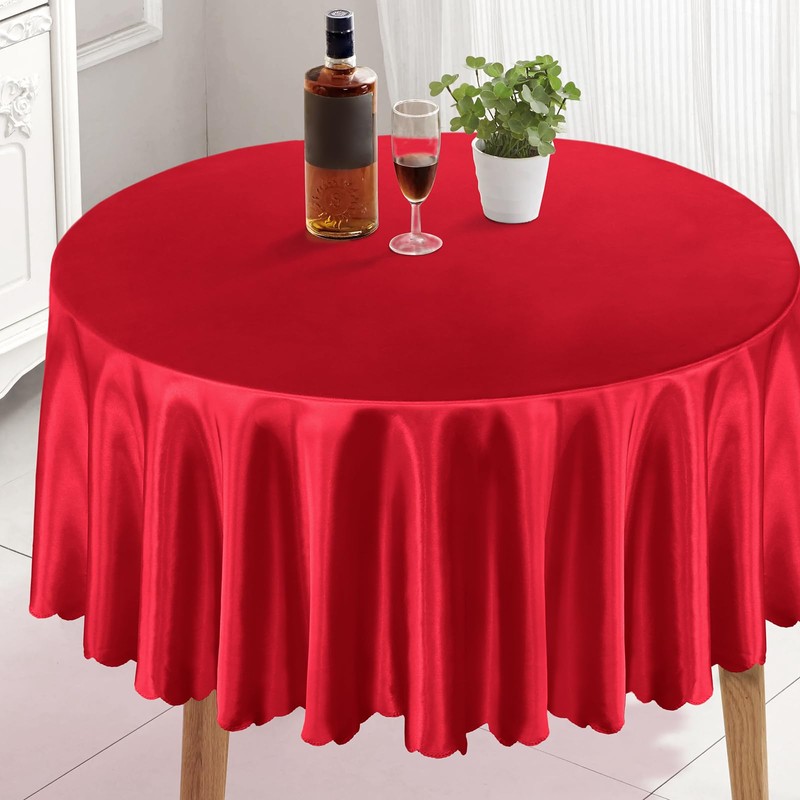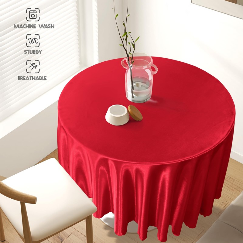 - ROUND SATIN TABLE COVER - Made of 100 Percent Polyester (Satin Fabric), shinny finish classic looking, super smooth, soft and comfortable and provides a luxurious and silky touch, not easy to fade, not shrink, reusable.