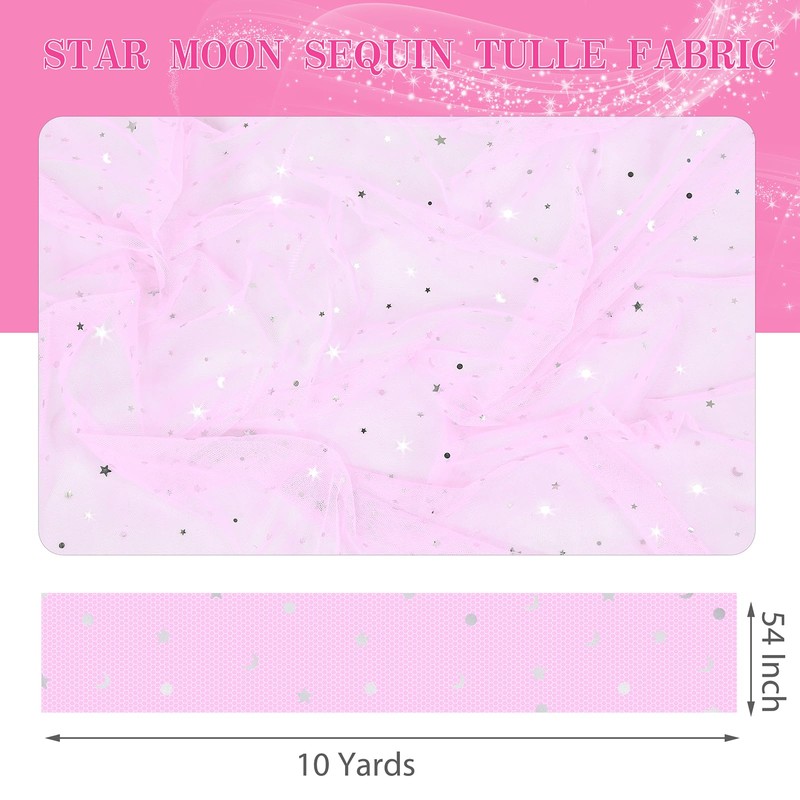 - WIDE USE SCENARIOS - By upgrading the production process, we have added sequins in the shape of stars and moons on top of the sheer tulle fabric, which will glow beautifully in the light, and the dreamy decoration can create a romantic atmosphere for you. Sequin tulle fabric is suitable for making table runners, table skirts, stairs bow, wedding backgrounds, bridal veil skrit.