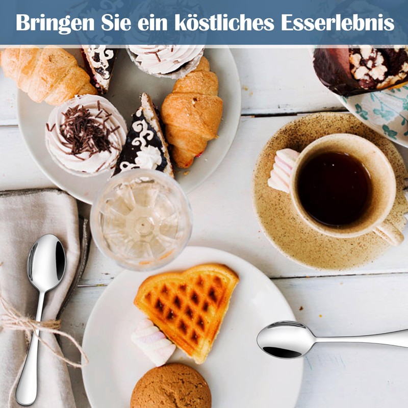 - Set of 6 - Comes with 6 pieces 13.5 cm small coffee spoons, sufficient quantity and no need to worry about a lack of spoons, this stainless steel tea spoon set can be used for many types of occasions, such as parties, celebrations, family dinners, picnics and birthdays, etc. This small spoon set would give you different food and drink needs, ice cream, yogurt, soup, stew and a variety of other foods, these desserts. One large addition to your afternoon tea