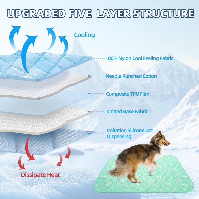 - KEEP YOUR PET COOL: The cool pet pad is composed of 5 layers of structure, respectively nylon cool feeling fabric, needle punched cotton, composite tpu film, knitted base fabric and imitation silicone dot dispensing. Get one today and treat your furry friend to the ultimate cool and comfortable lounging experience