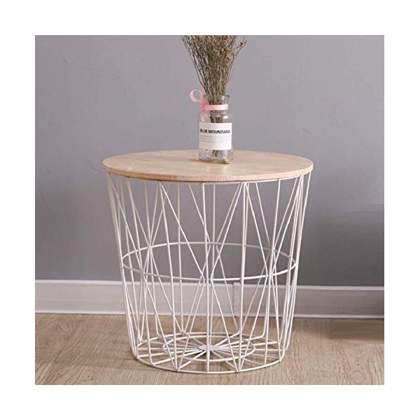 - Wire Metal Basket Side Table with round MDF wooden table top, minimalist home decor.