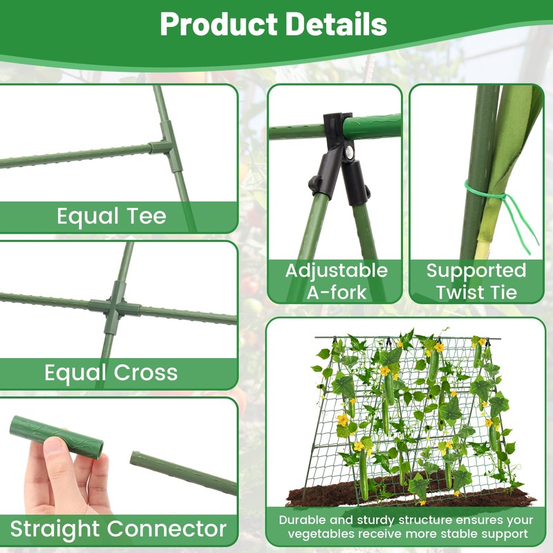 - Adjustable A-frame design with 2 growing surface gives the growth of cucumber vines more sunlight and room to breath and develop.