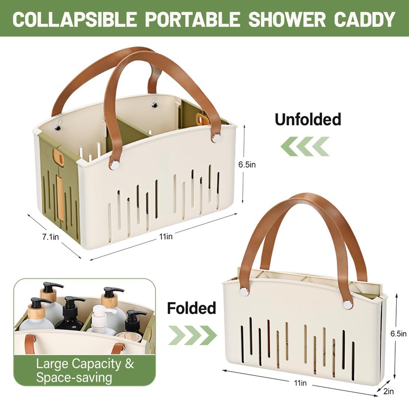 - Perfect Size & Removable Divider: Portable shower basket is 11*7.1*6.5 inches when unfolded, roomy capacity with detachable divider, easy to store your various bathroom essentials such as shampoo, lotion, conditioner, shaving cream, facial cleanser and so on